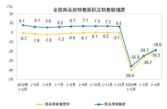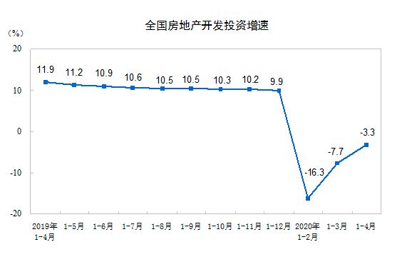 5月15日,國家統(tǒng)計(jì)局發(fā)布2020年1-4月份全國房地產(chǎn)開發(fā)投資和銷售情況。1—4月份,全國房地產(chǎn)開發(fā)投資33103億元,同比下降3.3%,降幅比1—3月份收窄4.4個(gè)百分點(diǎn)。其中,住宅投資24238億元,下降2.8%,降幅收窄4.4個(gè)百分點(diǎn)。商品房銷售面積及銷售額也顯示房地產(chǎn)市場復(fù)蘇,商品房銷售面積降幅比1—3月份收窄7.0個(gè)百分點(diǎn);銷售額降幅收窄6.1個(gè)百分點(diǎn)。