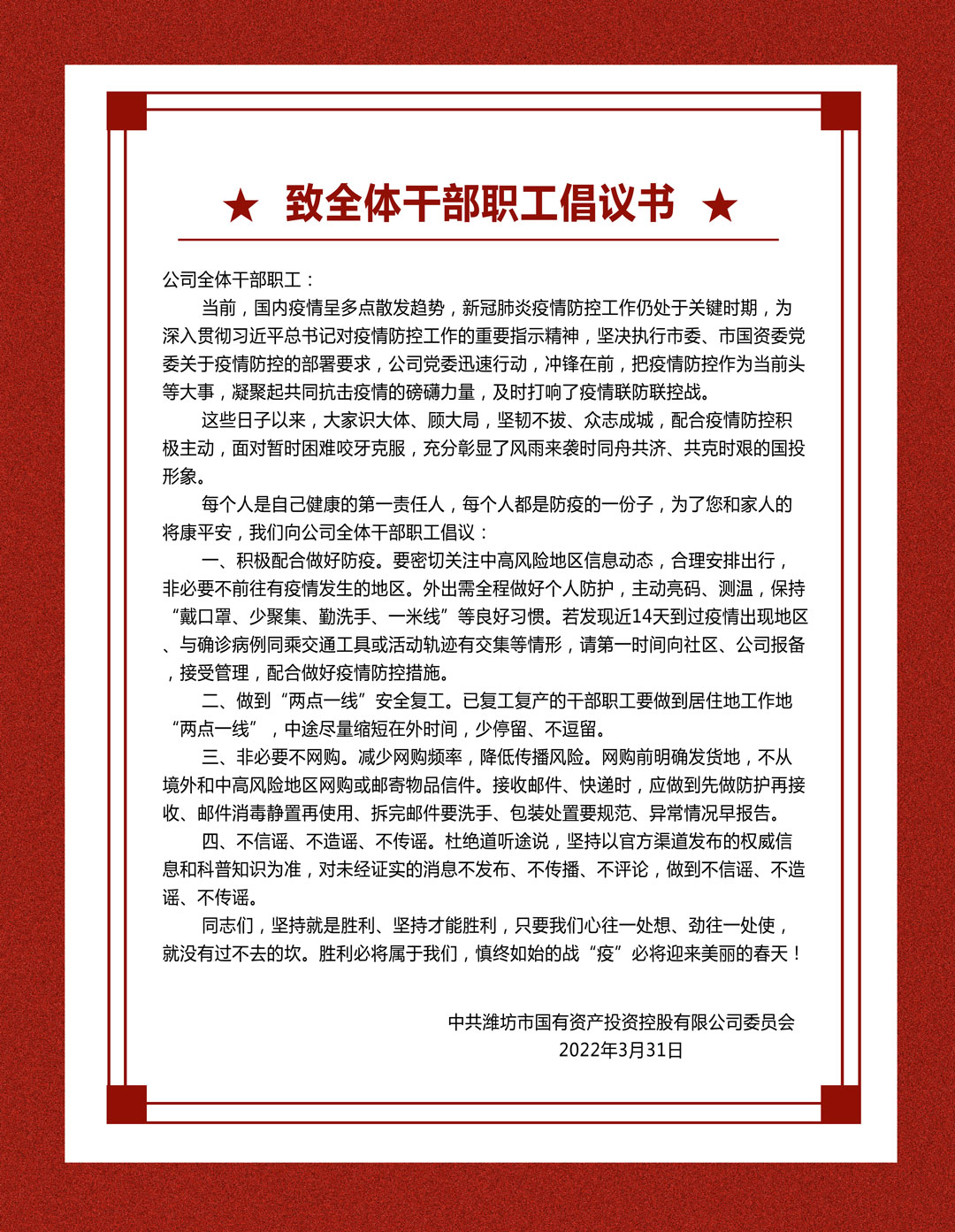 致公司全體干部職工的倡議書(shū)